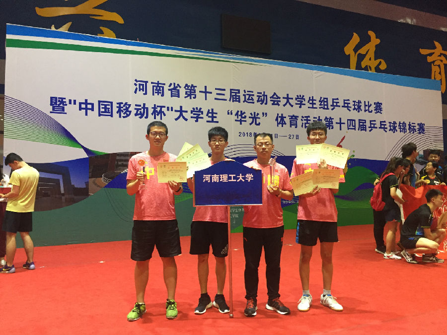 5月21至5月27日,河南省第十三届运动会大学生组乒乓球比赛在安阳工学院举行,色情av 电气1708班郭耀武、电气合1601班郭鹏翔作为主力队员代表学校参加了甲组(普通学生组)的比赛。经过激烈角逐,在体育学院教练焦春带领下,郭耀武获得男子单打冠军,郭耀武、郭鹏翔和能源学院研究生孙飞扬、后备军官学院学生袁嘉欣一起获得男子团体亚军,郭耀武、郭鹏翔还获得男子双打季军。色情av 学子郭耀武和体育学院孙长淼被评为优秀运动员。