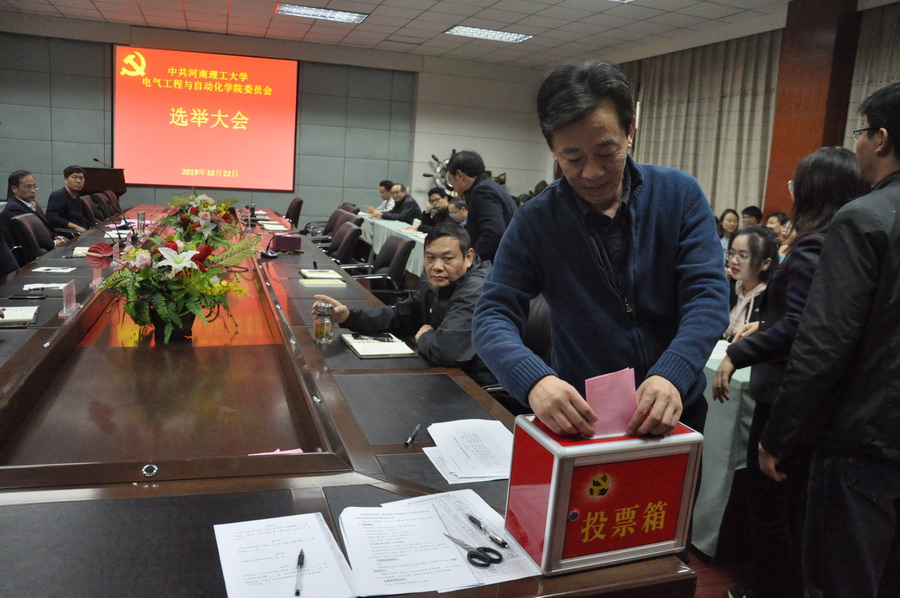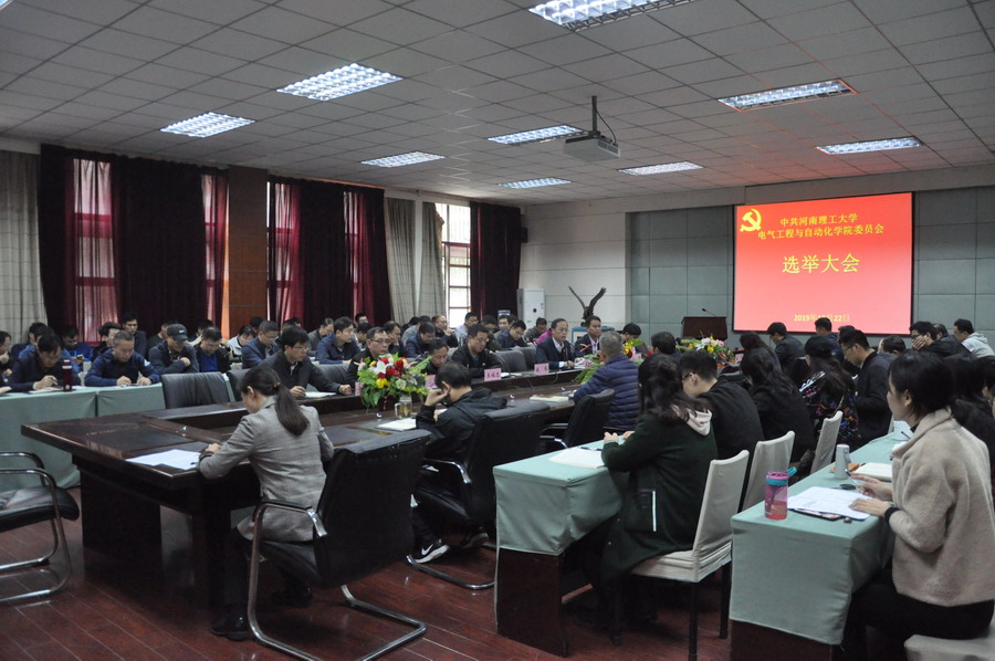 10月22日下午,中共河南理工大学色情av 委员会选举大会在电气楼101室召开。学院党委书记欧阳文峰、执行院长钱伟、党委副书记王瑞等党委委员出席并在前排就座,学院98名党员(代表)参加了此次大会。大会由预备会议和正式会议两部分组成。